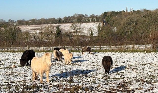 Well - we can't claim to compete with the Welsh hills or Aberdeen, but we have had a pretty snowy and very icy time since the new year! Heaving water tubs of warm water down to the field and/or taking a hammer to the ice in the troughs. The ponies aren't the slightest bit bothered by any of it! They have a big shelter that they rarely use. This is their climate and they're loving it!